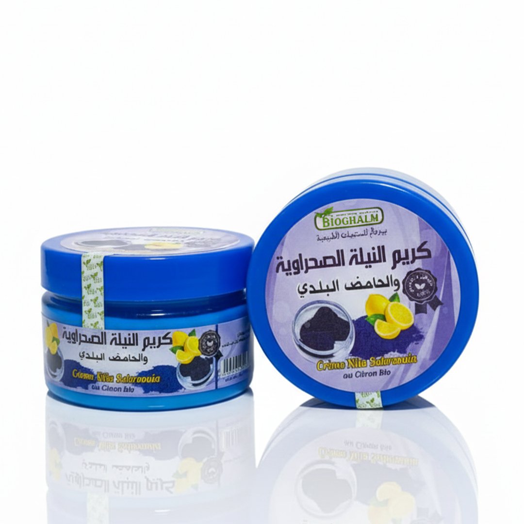 امنحي بشرتك العناية الطبيعية الفعّالة مع كريم BIOGHALM الغني بالنيلة الصحراوية والليمون العضوي.